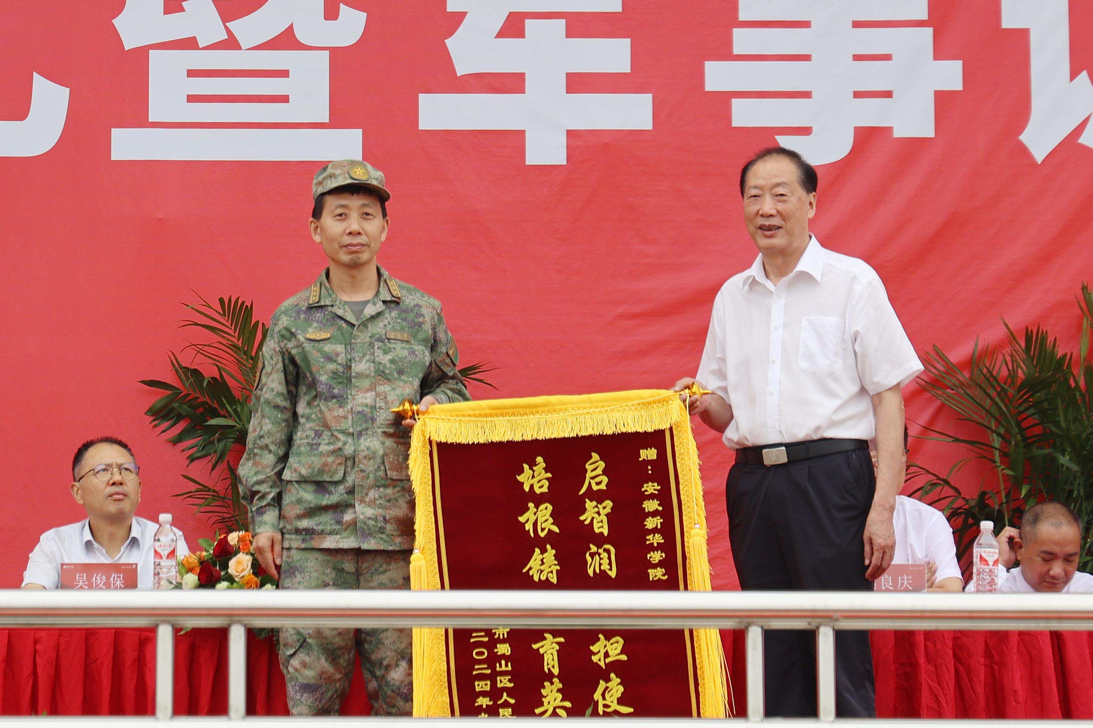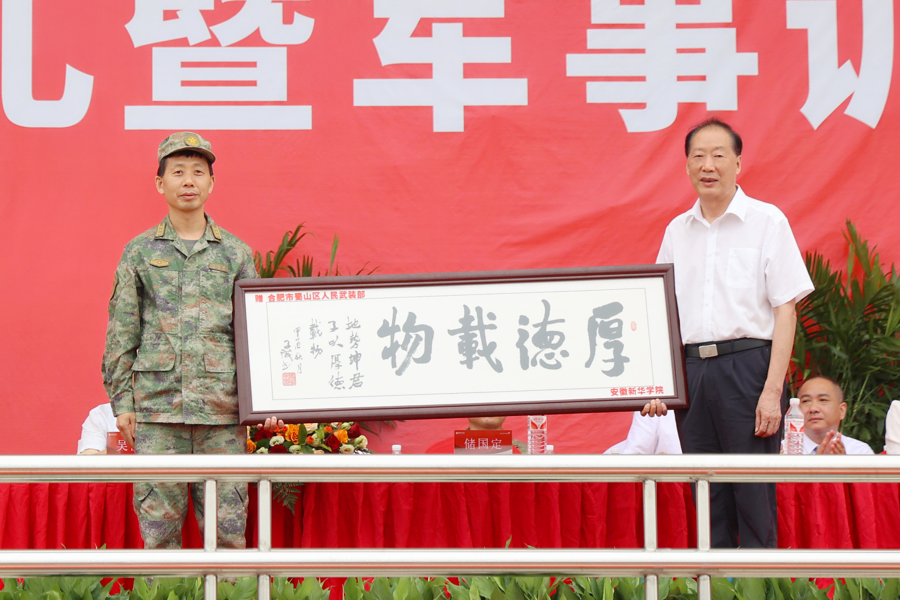 校董事长储国定代表学校向承训部队赠送牌匾,王仁凤代表承训部队向伟德官网赠送锦旗。