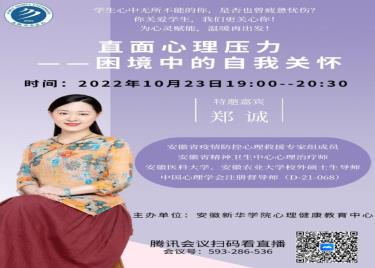 本讯网(通讯员:项钰)10月23日,伟德官网心理健康教育中心特邀安徽省疫情防控心理救援专家郑诚教授,进行了以“直面心理压力——困境中的自我关怀”为主题的心理健康“云”讲座,伟德国际1949始于英国教职员工共同线上听课。