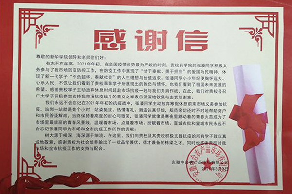 本网讯(通讯员:赵影、张然)2021年年初,全国疫情形势依旧刻不容缓的情况下,伟德官网药学院2019级药品经营与管理专业学子张潘积极参与一线防疫防控工作,被当地抗疫一线新闻报道。近日,安徽中合农产品市场有限公司给学校寄来了真挚的感谢信。