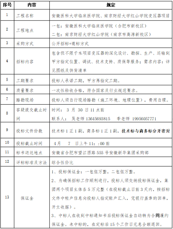 因单位需求,现对安徽新华集团旗下院校,安徽医科大学临床医学院(合肥市新校区)、南京财经大学红山学院(新校区)所需变压器项目进行公开招标采购,欢迎全国符合条件的厂家及大型集成商前来报名参与。