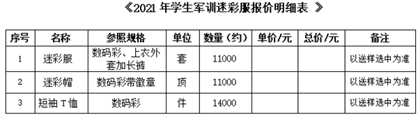 根据集团2021年工作计划,现对集团旗下各单位2021年学生军训迷彩服进行年度询价招标采购,欢迎全国符合条件的单位前来报名参与。