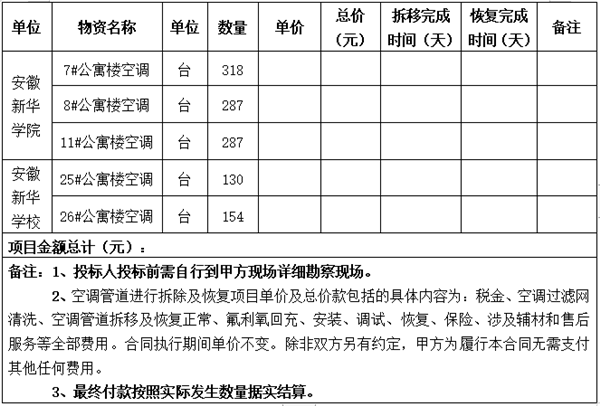 1)伟德国际1949始于英国7#、8#、11#公寓楼和安徽新华学校的25#、26#公寓楼的空调内机拆移、安装恢复项目