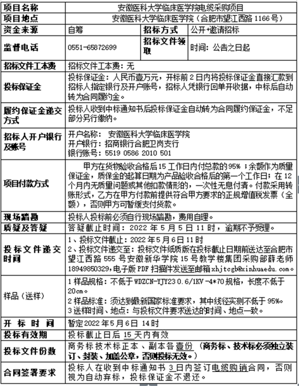 安徽医科大学临床医学院电缆采购项目招标公告
