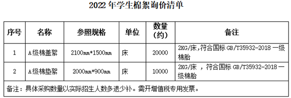 2.招标项目:2022年新生公寓物资(棉絮)采购项目