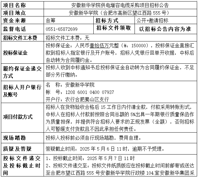 3.1开标时间和地点:暂定2025年5月7日15时,地点:新华集团采购部会议室;