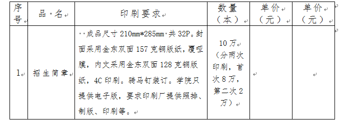 1、报价表(必须密封):报出每种规格印刷品的单价和总价及合计总价(含税、送货上门价);