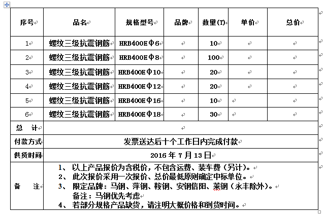 2.须注明各自产品单价和总价、付款方式、最快供货时间、装货费用及运输费用等。