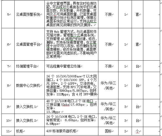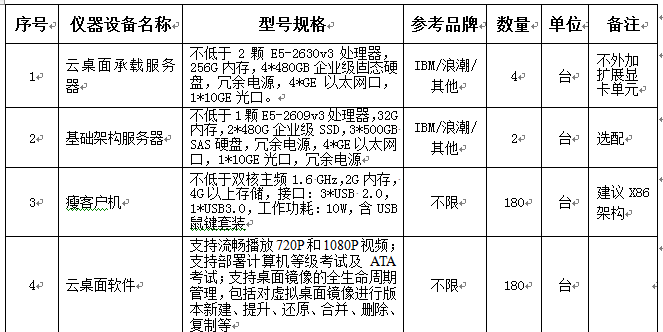 3、招标内容:三间机房共计180个点的云桌面,考虑到后期扩增建设,其中服务器集群部署到专用弱电间机房,同时考虑共享存储支持及可扩展后期GPU虚拟化支持(具体设备规格参考如下但不局限于此:以客户机性能体验为主,要求客户机最低配置:内存≥3G、显存≥256M)