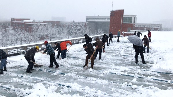 随着4日中午雪势的增大,为防止校大礼堂房顶、自行车棚、开水房屋顶积雪负载过重,总务处相关行管人员带领维修工们分区域冒着风雪连续奋战,目前大礼堂、开水房屋顶及自行车棚的积雪正在持续清除中。此次的暴雪导致校园路面积雪深达十几公分,由于雪水的踩溅使得通往室内的地砖台面尤其湿滑,为确保广大师生的行路安全,总务处临时在人流量大的路段设置禁行围栏并及时安排物业公司人员、食堂及开水房员工清理主通道入口积雪并在行人较集中的路段和出入口铺设防滑垫、放置防滑警示牌。