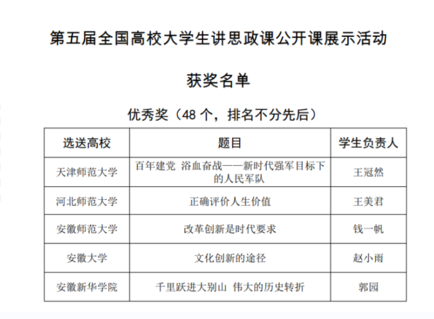 本网讯(通讯员:董丽娟)近日,由教育部高校思政课教学指导委员会主办,南开大学马克思主义学院承办的“领航计划”系列活动之“百年辉煌路 奋斗正当时”——第五届全国高校大学生讲思政课公开课展示活动评选结果出炉。经省级遴选推荐和教育部专家评审,由伟德官网马克思主义学院教师团队指导,2019级财会与金融学院审计学1班郭园同学的作品《千里跃进大别山 伟大历史的转折》获得优秀奖,学校为安徽省3所获奖院校之一。伟德官网是首次参与大学生讲思政课公开课展示活动,并入围全国决赛获优秀奖。