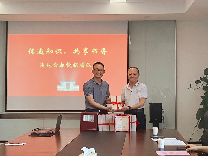 吴教授表示:“这些书陪伴了我大半生,如今我希望它们能找到更好的归宿,继续发挥作用,为年轻学者提供帮助,为学术发展贡献一份力量。”随后,图书馆副馆长汤干君接收了吴教授的赠书。