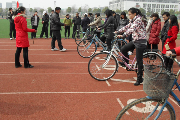 在田径场的百米赛道上,布置了20米长的比赛区域。裁判员一声令下,选手们小心翼翼出发了。自行车慢骑,不许定车,不许压线,比的就是谁更慢。有的选手骑得十分顺利,却不知道自己已经“一骑当前”了;有的选手一心想骑得慢,结果掌握不好车子的平衡,脚着地,反而犯规出局了;还有选手充分总结经验教训,专门把车胎的气放掉,骑着轮胎瘪瘪的自行车,车速似乎是慢了不少。看大家骑着自行车歪歪扭扭地前行,欢笑声时不时响起。比赛中,老师们暂时远离了平日繁忙的工作,得到了实实在在的放松。
