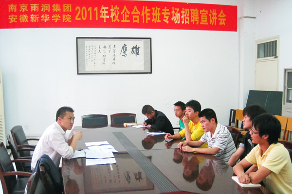 此次雨润集团来学院举办招聘宣讲会是今年三月份学院与南京雨润集团签订校企合作订单培养协议的具体落实。根据学院与南京雨润签订的校企合作协议方案,此次,拟在学院2012届物流管理和机电一体化两个专业的学生中选聘80名学生组建“雨润班”,以“2+X”的培养模式进行培养,即在校学习两年,其余时间在甲方或其下属企业进行实习。在此期间,雨润集团可选派技术人员、中高级技师担任兼职教师,参与“雨润班”的教学,同时,学院会按照企业人才培养要求设置课程、组织教学,确保人才质量。此外,雨润集团对该班学习优秀的学生每年将颁发“雨润班助学金”,学生毕业加入集团工作满一年后,集团提供两年内报销全额学费的优惠政策。