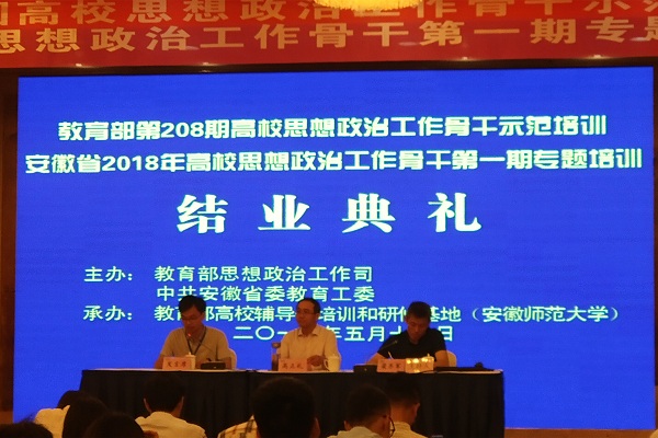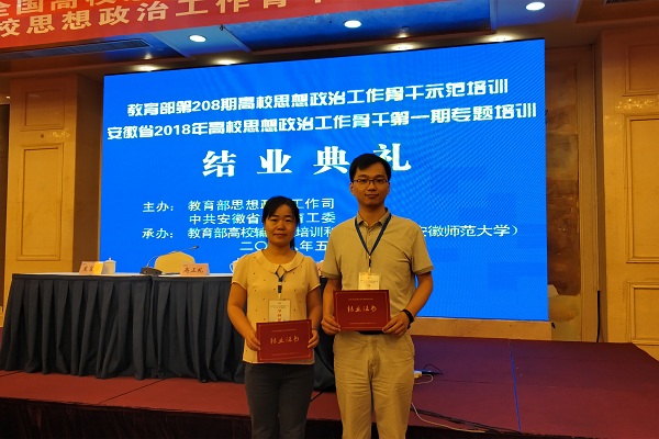 本网讯 (通讯员:周景、苏荣萍) 为深入学习宣传贯彻落实习近平新时代中国特色社会主义思想和党的十九大精神,把全国全省高校思想政治工作会议精神贯彻落实引向深入,进一步提高高校思想政治工作骨干的综合素质和能力水平,根据《高校思想政治工作质量提升工程实施纲要》《普通高等学校辅导员队伍建设规定》和《安徽省高等学校辅导员培训计划(2016-2020年)》要求,教育部高校辅导员培训和研修基地(安徽师范大学)于5月16日至5月18日举办教育部第208期高校思想政治工作骨干示范培训暨安徽省2018年高校思想政治工作骨干第一期专题培训。本次会议共有近300名全国高校代表参加,外国语学院副院长周景、财会与金融学院辅导员苏荣萍代表伟德官网参会。