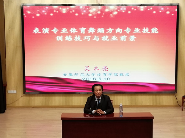 本网讯(通讯员:闫井明)5月10日,文化与新闻传播学院邀请安徽师范大学体育学院吴本亮教授来伟德官网新闻演播厅举办“表演专业体育舞蹈方向专业技能训练与就业前景”专题讲座。2017级表演(体育舞蹈)专业全体师生聆听了本场讲座。