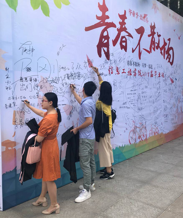 6月20至21日,为了营造文明和谐的离校氛围,信息工程学院专门设计制作了主题为“青春不散场”的2018届毕业生主题签名墙,搭建毕业寄语签名墙,让青春永驻,让感恩常在。6米长的毕业签名墙下,炎炎烈日也没有阻挡毕业生们参与活动的热情,学生们纷纷赶到签名墙下签上自己的名字,并与同窗好友、母校恩师合影留念。