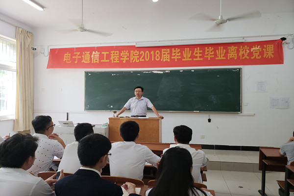 本网讯(通讯员:孙晗)为加强毕业生党员思想政治教育,进一步鼓励其发挥党员先锋模范带头作用。6月20日下午,电子通信工程学院党总支举办了2018届毕业生党员“最后一堂党课”活动。电子通信工程学院党总支书记计勇主讲,毕业生党员60余人参与聆听。
