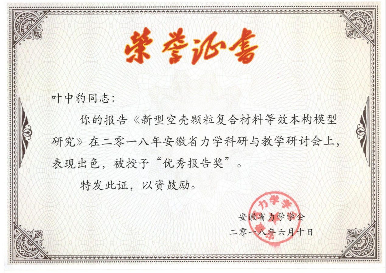 下午,伟德官网教师叶中豹作“新型空壳颗粒复合材料等效本构模型研究”学术交流报告,因表现出色,被授予“优秀报告奖”。