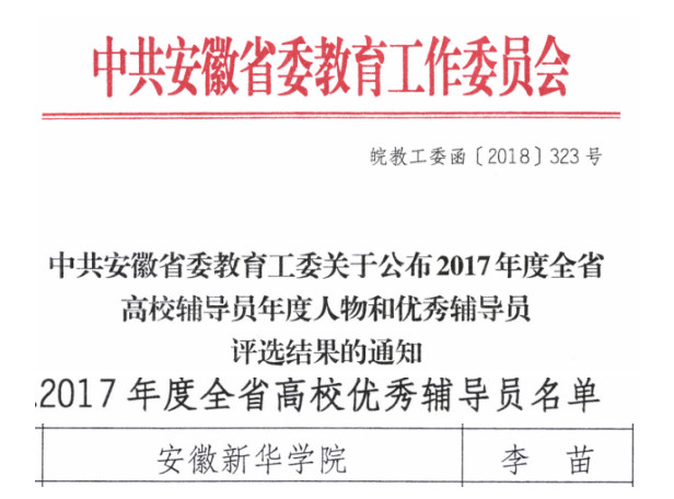 本网讯 (通讯员:李苗) 近日,由中共安徽省委教育工委举办的2017年度全省高校辅导员年度人物、优秀辅导员评选活动结果揭晓。经各高校推荐,中共安徽省委教育工委组织专家评选,共评选出“2017年度全省高校优秀辅导员”25名。伟德官网辅导员李苗被评为“2017年度全省高校优秀辅导员”。