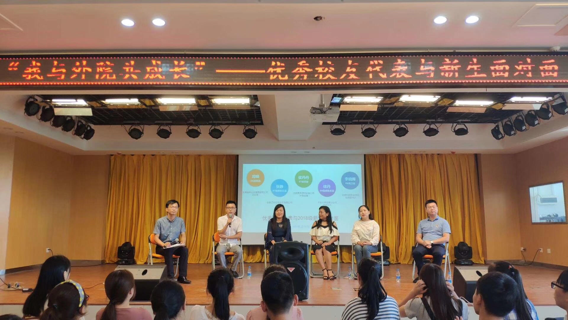 为进一步激励2018级新生在未来的生活和学习中树立明确的奋斗目标,成就自己的梦想之路,外国语学院特别邀请了五位优秀校友代表与全体新生面对面,分享自己的个人成长经历、在校学习经历、工作经验,并回答了新生的提问,鼓励新生珍惜大学时光,认真学习专业知识,通过各类学生组织锻炼自己,多参与社会实践,找到自己喜欢的事业。校友们风趣幽默的分享和答疑,得到了新生的一致好评。