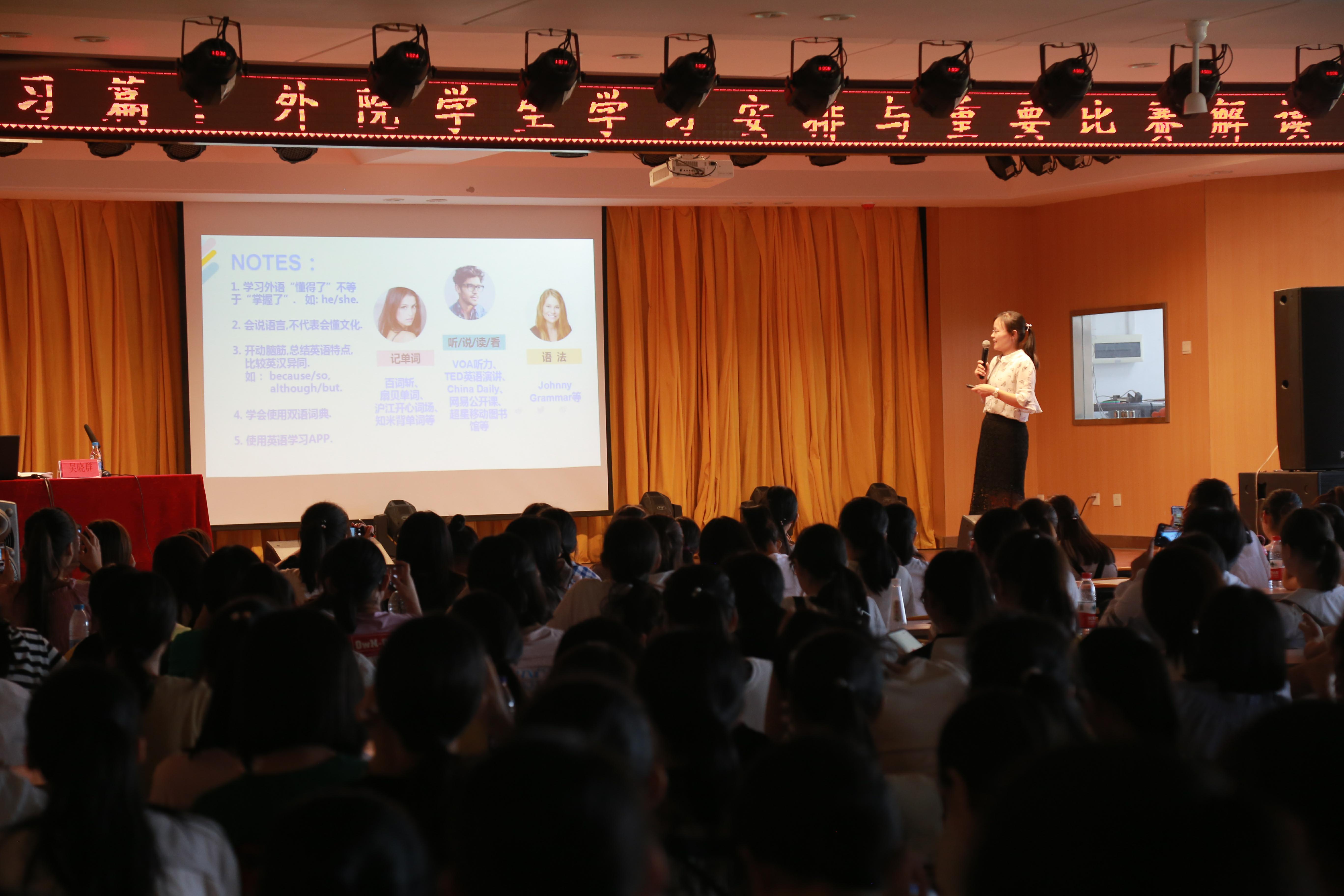 本次入学教育,外国语学院还邀请了部分优秀学生代表为新生作主题分享,包括团学青年成长,如何做好一名学生干部,出国研修游经历分享,学科竞赛经验分享,国奖获得者经验分享。学长学姐的分享赢得了全场的热烈掌声,让在场的新生看到了希望,明确了自己奋斗的目标。
