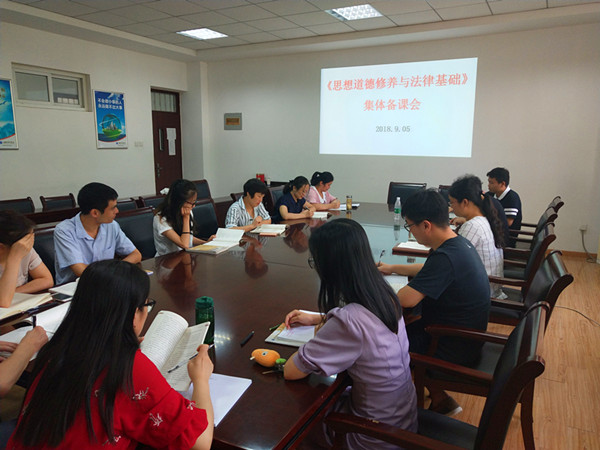 本网讯(通讯员:许阳)思想境界关乎人生道路,人生理想引领社会风尚,为上好2018级新生第一堂《思想道德修养与法律基础》课,9月5日,思政部课程组召开集体备课会,《思想道德修养与法律基础》课程组全体教师参加会议。