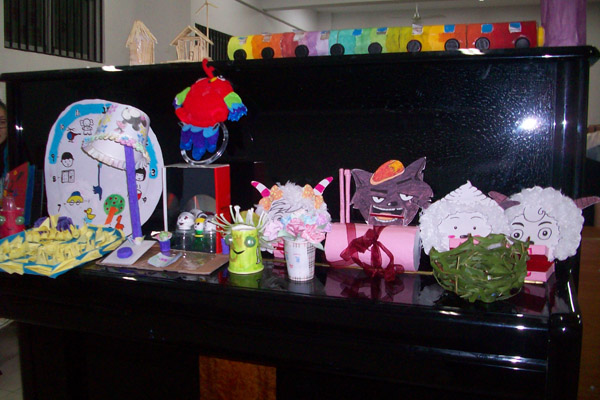 为了培养学前教育专业学生的创新思维和动手能力,殷老师契合当前幼儿教育实践的需要,将幼儿喜爱玩具的天性和智育与美育的培养紧密结合,要求师范生们通过自己的手工玩具制作来开发幼儿的智力,激发幼儿欣赏美和表现美的能力。同学们在老师的启发引导下,充分发挥自己的想象力。他们分组活动﹑分工协作,最终,出色地完成了各自的创意。七彩梦幻火车——材料源于废弃的饮料瓶,幼儿们可以一边玩开火车的游戏,一边学习颜色;会说话的喜羊羊与灰太狼——制作主材料为硬纸壳,特色在于它们都有着会动的嘴巴,可以在故事讲述中锻炼幼儿的模仿表达能力;布鱼、布书——撕不烂的玩具和书本,侧重于幼儿的触摸式学习,充分调动孩子们的多种感官体验。此外,还有数字时钟、灯下读书、一家人、田园风光,装甲坦克、数字盘等手工益智玩具,它们的制作材料多源于常见的生活闲置物,对于幼儿具有潜在的环保教育意义。