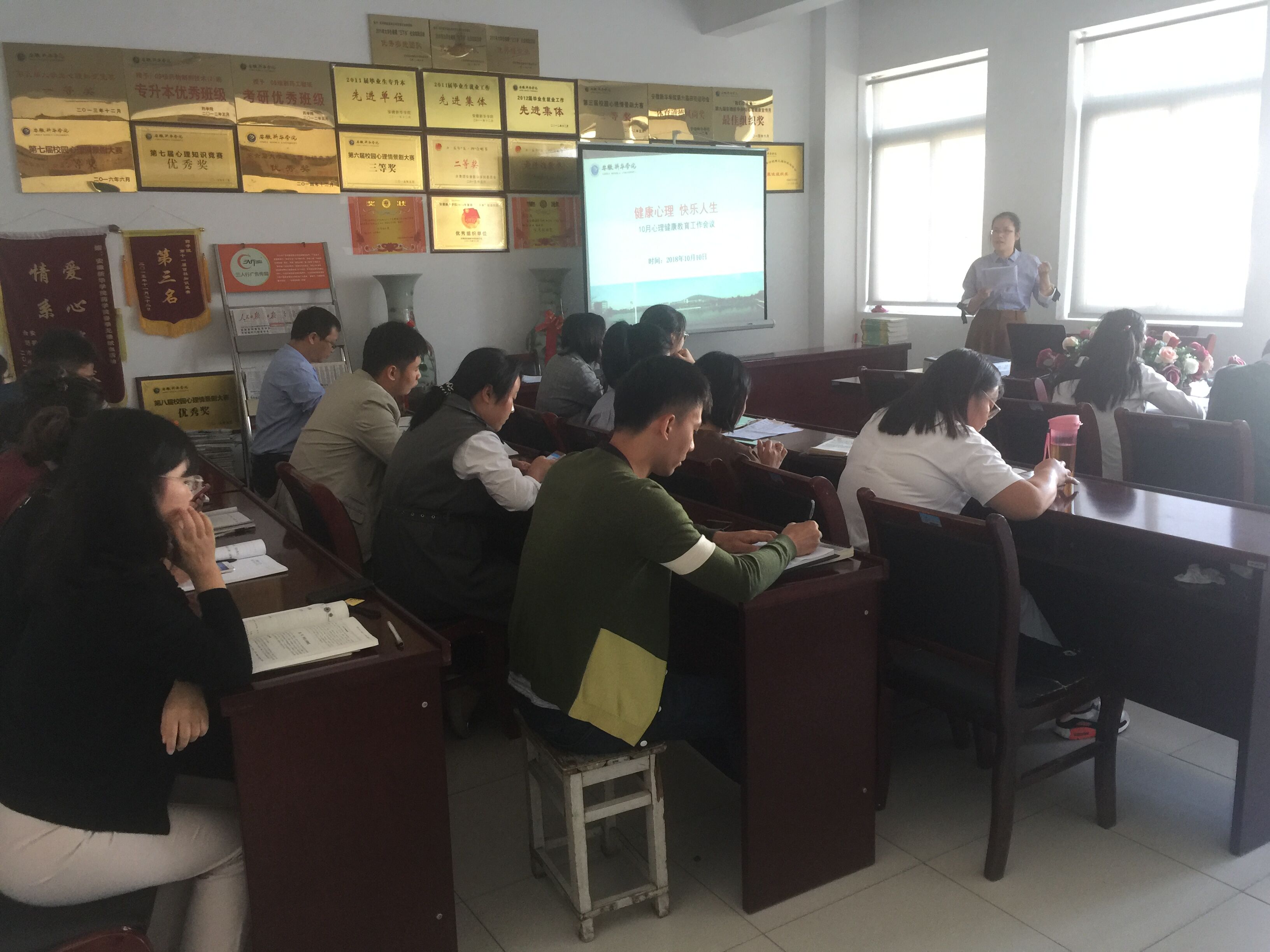 今年我国“世界精神卫生日”的主题是“健康心理,快乐人生”,会上,各二级学院心理工作负责老师分享了各自院系开学至今心理健康教育工作开展情况;新任专兼职教师开展了《大学生心理健康教育》课程课前试讲。凌晨对各二级学院心理健康教育工作的开展给予了肯定,对2018级新生心理普查、心理健康教育课程授课及各院系心理安全工作进行了布置安排,重点强调新生心理普查规范操作,新生和毕业生的心理调适与心理疏导工作。