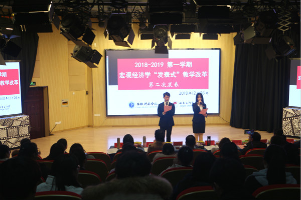 分享交流会包括宏观经济学课程“发表式”教学改革、期望效用理论简介两个环节。商学院经济学教研室组织的宏观经济学“发表式”教学改革内容从搜集数据、查询文献、撰写报告书和PPT制作及发表等方面对参与教学改革的7组学生进行评分,现场评选出“最具创意奖”“两个团体奖项”和“最优PPT制作者”等奖项。