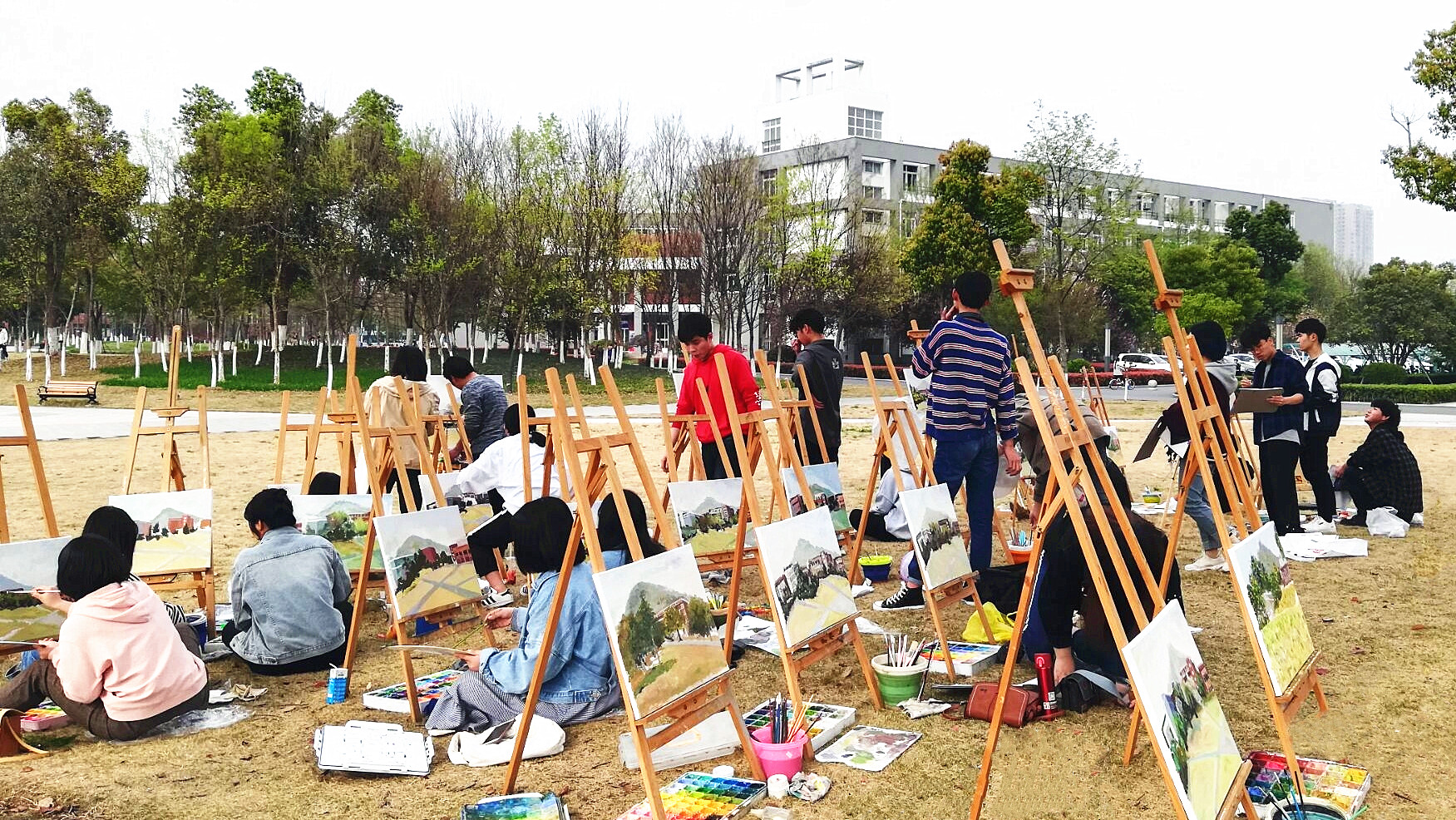 走出教学楼,黄坤带领学生们来到华园景色优美的中央广场,学生们带着花架,拎着画箱,面对风景如画的华园图书馆开始一下午的创作课程。黄坤教师给学生们做好画作示范,要求学生们根据华园不同风景的角度选择、光线调整等进行此次画作。学生们尝试用各种不同的形式手法,从不同的视角细心描绘画,将眼前的美景化为笔下一幅幅美丽的画卷。课程期间,黄坤在也会在一旁给大家指导、修改和调整笔触,帮助学生们绘制美丽华园。