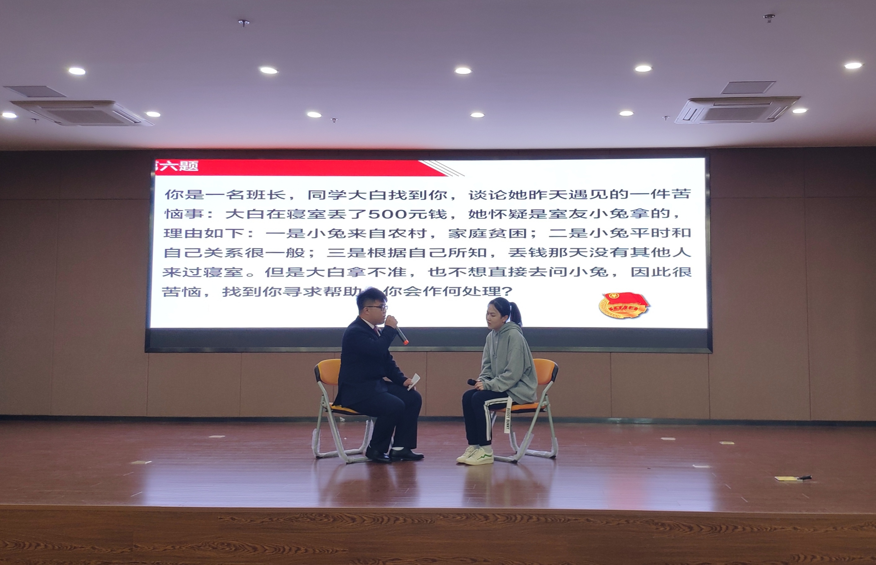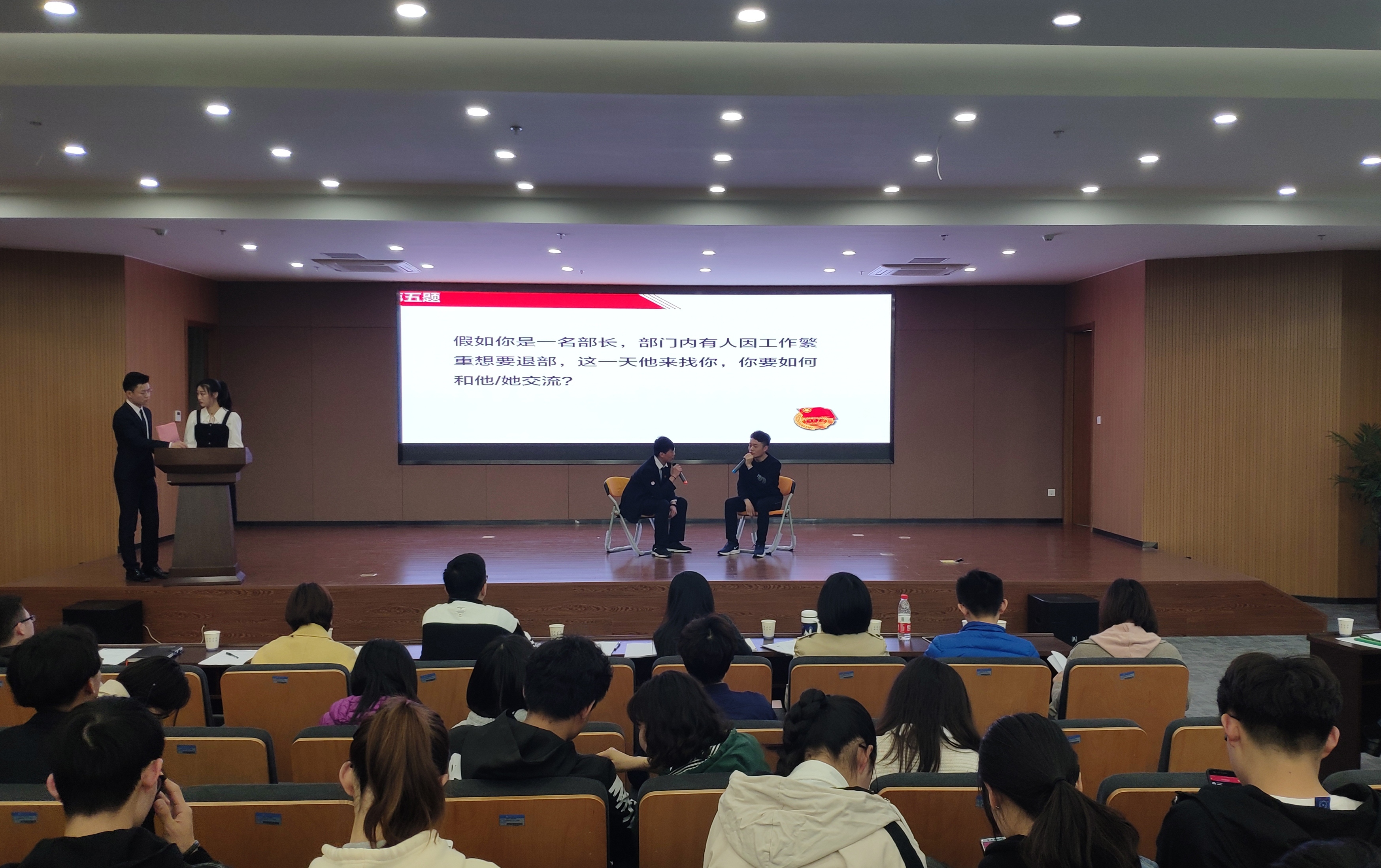 经过前期院级初赛和校级复赛,共有16支队伍进入校级决赛。决赛分为理论知识抢答、情景模拟、微团课宣讲等3个环节。理论抢答环节各参赛选手分秒必争,展现厚实团学理论功底;情景模拟环节选手们针对困扰大学生学习和生活的问题展开案例分析和情景模拟,结合大学生文明养成、大学生诚信教育、学生干部作风建设、学生干部服务意识等话题分享观点,畅谈在日常工作中的所感所思。在微团课演讲环节,演讲者围绕“勇立潮头话担当”“奋斗的青春最美丽”“爱国主义是中华民主民族精神的核心”等主题,结合团学骨干工作实际和成长经历,用新颖的视角,身边的故事,通俗地展开微团课演讲,给现场观众留下深刻的印象。