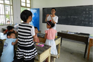 队员们把支教活动命名为“爱心课堂”,内容涵盖了自然科学、趣味语文、英语和美术。课堂上,从未接受过多媒体教学的孩子们被有趣的课件所吸引,纷纷簇拥在队员旁边观看电脑上的内容。天气炎热,细心的实践队队员还为孩子们买来冷饮消暑。