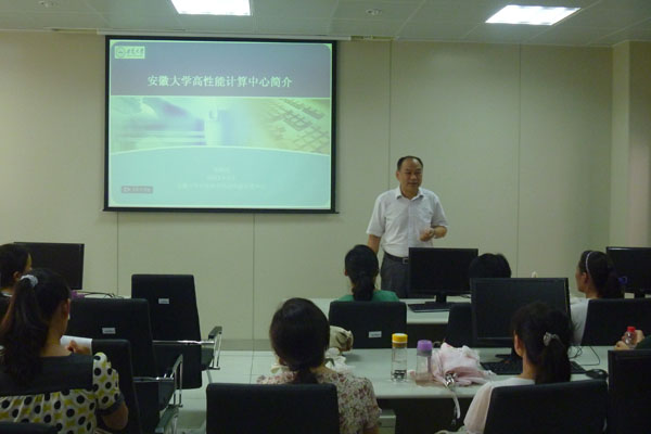 安徽大学新区计算机科学与技术学院周宇晗书记、系主任刘锋教授接待了信息工程学院教师,带领大家参观了“高性能计算中心”实验平台中心机房及教学机房,并重点就“高性能计算中心”实验平台进行了详尽的介绍。“高性能计算中心”实验平台总投资1000万元,采用的是浪潮自主研发的八路服务器天梭TS850,囊括高密度刀片、胖节点、IO节点、GPU节点、管理节点等不同类型的节点,整体计算峰值跃居国内高校行业前十,主要承担计算机仿真设计和计算化学类等前沿应用,对计算机、电子、工程、物理、材料、化学、生物等学科的建设提供有力支撑,并对其他省属院校起到良好的带动和示范作用。