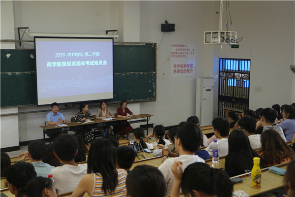 本网讯(通讯员:王超)为响应近期教育部对本科生“合理增负”的号召,落实“把课堂教学建设强起来、把课堂教学质量提起来”,以及“要全面梳理各门课程的教学内容,淘汰“水课”、打造“金课”,合理提升学业挑战度、增加课程难度、拓展课程深度,切实提高课程教学质量”的相关精神,2019年5月22日中午,伟德官网商学院贸经系在教5,319针对国际经济与贸易、电子商务和商务经济学3个本科专业、5个班级的大一学生举行了期末考试动员会。