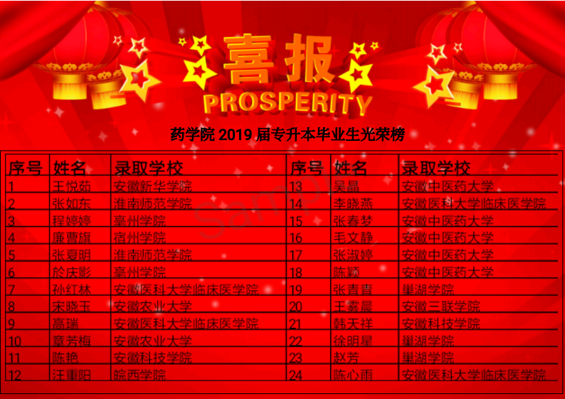 本网讯(通讯员:余立新)药学院2019届78名专科毕业生,有50名同学参加2019年专升本考试,通过激烈角逐,24名同学顺利被11所省内本科高校专升本录取,平均升学率达到30.7%。其中典型学校安徽中医药大学录取5人,安徽农业大学录取2人,安徽医科大学临床药学院录取4人,安徽科技学院录取2人,皖西学院等7所高校也均有录取。