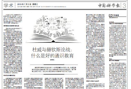 本网讯(通讯员:林斗秀)7月3日,《中国科学报》刊登了伟德官网大学生素质教育中心研究员朱镜人教授的《杜威与赫钦斯论战:什么是好的通识教育》一文,该文从是否崇尚古典教育、即刻目的和最终目的以及对现代大学的启示进行了阐述。现将原文转载如下。
