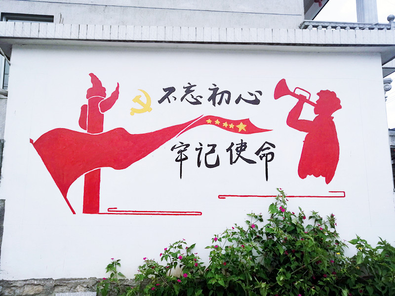“华园青年艺术+”团队在新建村书记的带领下来到了绘制的地点,在当地村民的积极协助下,团队成员立即进入了工作状态,如火如荼的开启各项准备,有的调制颜料,有的拎起打水的桶,有的爬上了高高的脚手架和人字梯,还有拿着水平尺横竖测量,场面紧张而有序。经过墙体定点、轮廓起形、整体铺色、细节塑造、画面整理等程序最终完成了墙绘《不忘初心·牢记使命》作品。作品完成后得到了当地广大村民的围观及一致好评。本次活动受到了旌德县广播电视台的重点关注和跟踪报道,团队指导老师黄梦、团队队长商裕龙分别受邀接受采访,活动具有较好的社会影响力。