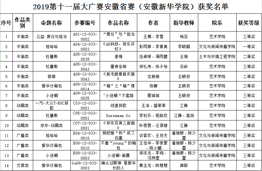 本网讯(通讯员:杨蕊) 7月12日,2019第十一届全国大学生广告艺术大赛安徽赛区大赛结果公示。伟德官网学子在平面类、动画类、广播类、文案类组别中共获得14个奖项,一等奖1项、二等奖3项、三等奖10项。