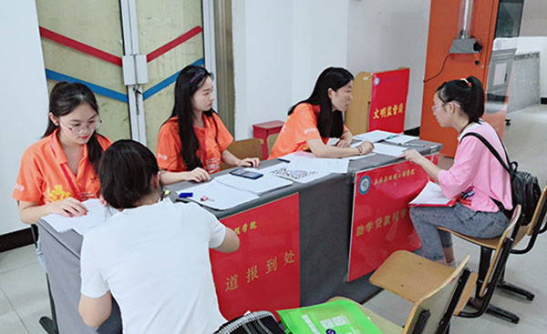专业咨询处,教师负责现场解惑答疑。他们向专业了解不清晰、目标不明确的新生介绍专业现状、就业前景、就业动态,耐心讲解专业概况,使新生对自己所学专业有了一定的基本认知。绿色通道处,工作人员确保家庭经济困难新生快捷、顺利完成报到注册手续。专业报到处,辅导员热情接待新生,登记学生基本信息,建立点对点联系。