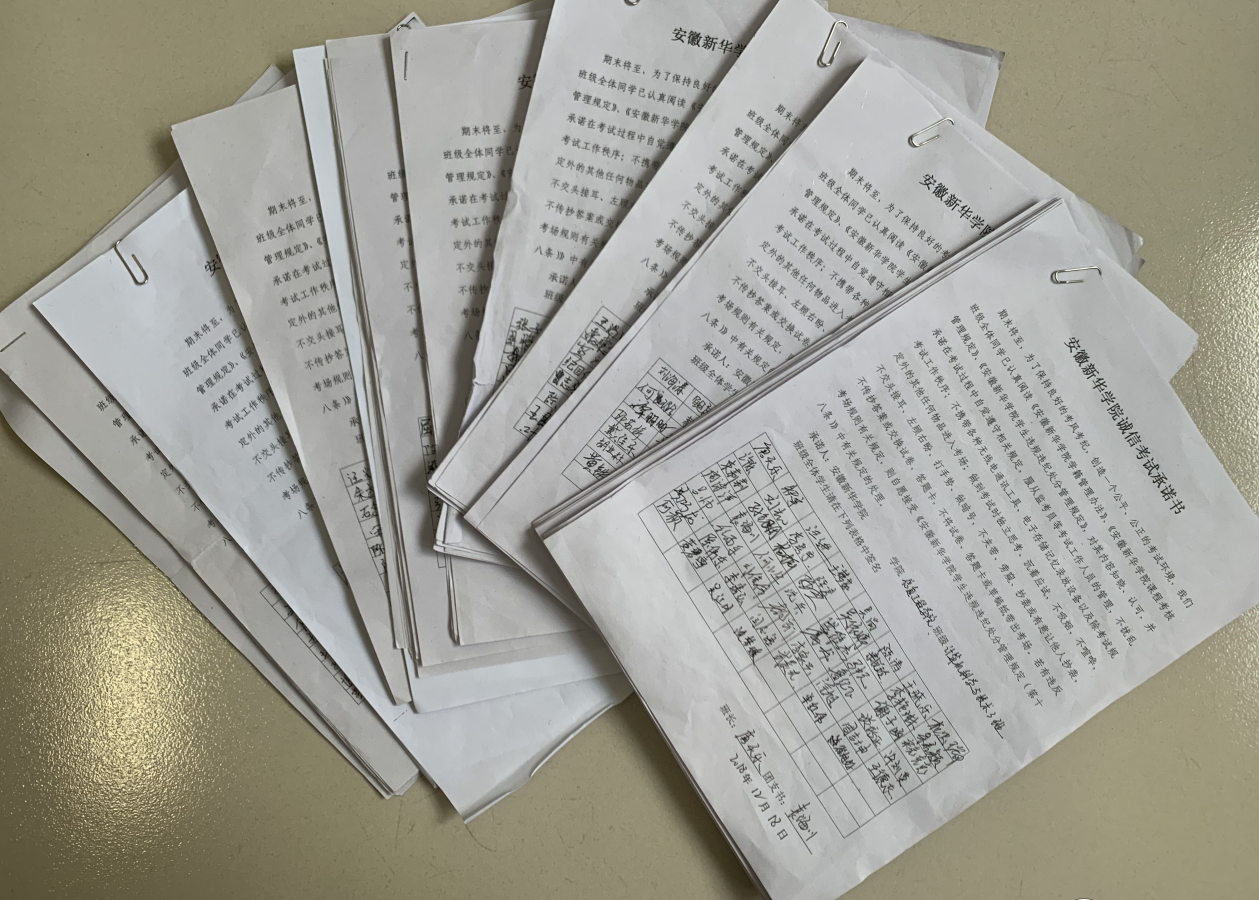 本次“诚信考试宣传月”中,各班级学习委员对班级课程的复习做了详尽的指导,强调备考阶段时间紧、任务重,同学们要根据自己的实际情况作出详细的复习计划,按照自己的复习计划认真执行。各班级纪律委员在主题班会中也宣读了学生手册中关于作弊的纪律处分,同时辅导员要求班级同学在诚信考试承诺书上签名,通过以上举措,层层压实责任,做到围绕诚信主题,落实主体责任。