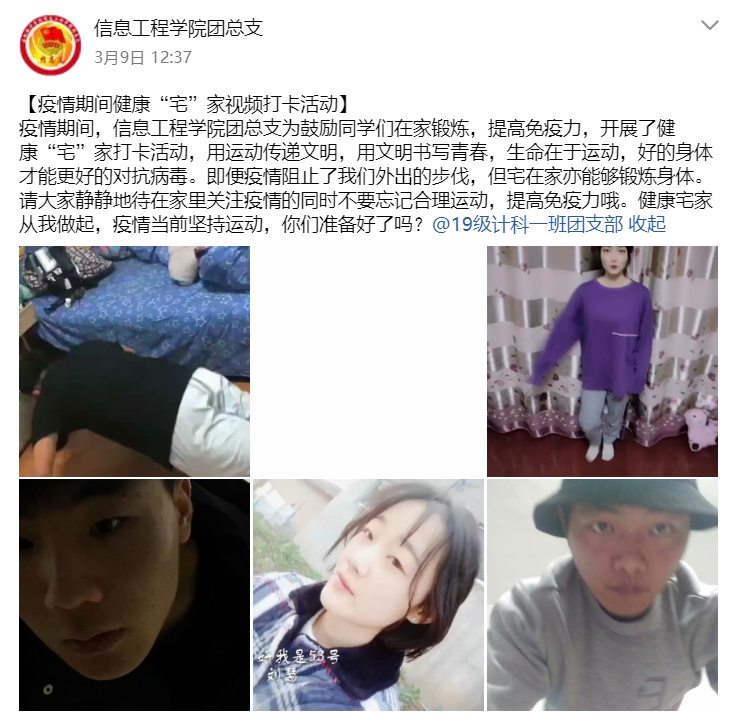 此外,信息工程学院团总支引导各团支部开展健康“宅”家视频打卡活动。活动参与覆盖面广,运动类型丰富。同学们纷纷表示,在家做适量运动不仅可以调节身体素质,还能增强免疫力。健康“宅”家活动倡导了居家健身理念,不断凝聚起全民健身、共抗疫情的正能量。