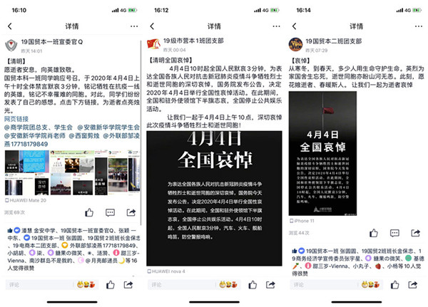 本网讯(通讯员:肖华君)4月4日,国旗半垂,举国同悲。庚子年清明节,全国各族人民深切悼念抗击新冠肺炎疫情斗争牺牲烈士和逝世同胞。商学院学子自发组织云端祭奠,通过收听收看广播电视直播、驻足默哀等形式,深切哀悼抗击新冠肺炎疫情斗争牺牲烈士和逝世同胞!