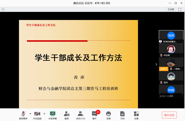 典礼之后,芮萍为大家带来了《学生干部成长及工作方法》的专题讲座,拉开了本次青马工程“云讲座”的序幕。她分别从高校学生组织的类型和现状、学生干部的角色、要求和培养、学生的素质和能力要求、学生干部工作、注重能力培养五个方面进行深入讲解,将理论联系实际,用真实案例引发学生思考,学生们纷纷表示此次课程受益匪浅。