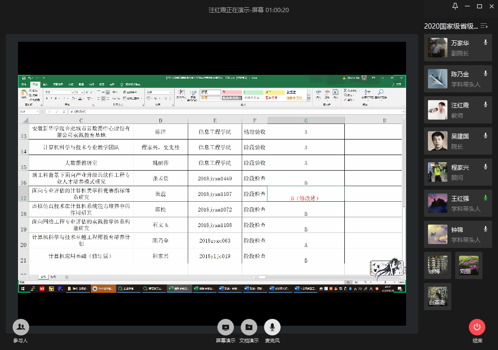 会上,万家华首先对此次 “质量工程”项目专项检查验收目的、要求及流程做了相关说明。随后,学院质量工程管理员汪红霞老师对各项目的前期网评情况进行了详细介绍,部分建设类项目负责人围绕项目建设任务要求、建设情况、存在问题与不足、下一步工作计划等进行了汇报。9位评审专家在认真听取了汇报后,对网评有异议的项目进行了重点复查,复议,并给出意见建议。