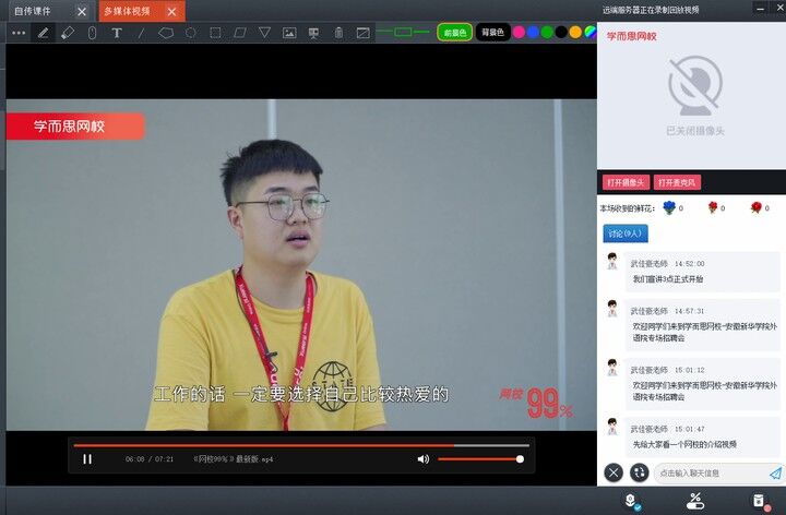 宣讲会开始前,线上会议室里播放了学而思网校相关的视频。随后,学而思网校人力资源部詹老师为毕业生进行了教育行业、好未来集团发展历程、公司文化与价值观、教学体系、业务板块、学校分布、工作岗位、岗位福利、职业发展、应聘方式的详细介绍。最后,詹老师一一对毕业生的提问进行耐心细致的回答。