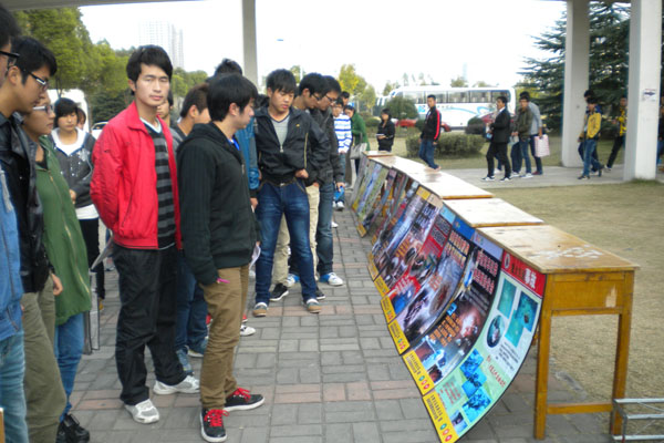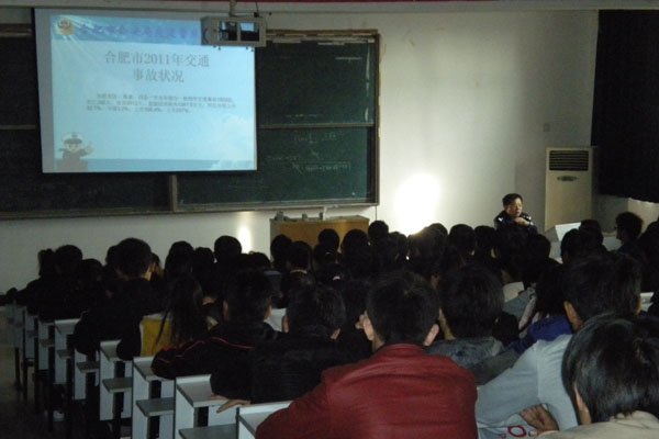 万玉荣用详尽的数据通报全国、合肥及高新区近几年发生的交通事故,分析了当前的交通安全形势;详细介绍了交通法规及道路出行注意事项,并通过事故案例、视频等阐述了交通事故对个人、家庭、社会所带来的危害。触目惊心的事故案例及场景深深的触动了大家,同学们深受教育。讲座结束后,组织同学们观看了交通安全图片展,并开展了 “喜迎十八大,牵手平安行暨交通安全记心中巡回签名”活动。