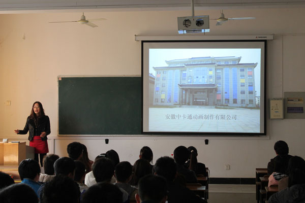 招聘会首先由中卡通集团人力资源部主任郑会会给同学们作了简单的介绍,展示了中卡通公司的发展历程,公司的部门和技术人员,播放了中卡通公司自主创新的代表作《九华小和尚》,以及其自主开发的动漫类衍生产品。目前中卡通公司已被选为第三批省文化产业示范基地之一。这也是中卡通公司跟伟德官网动漫学院校企合作的第三个年头,他们对动漫学院历届毕业生的评价很高,认为伟德官网学生综合素质比较好,在专业知识和动手能力方面有非常出色的表现。