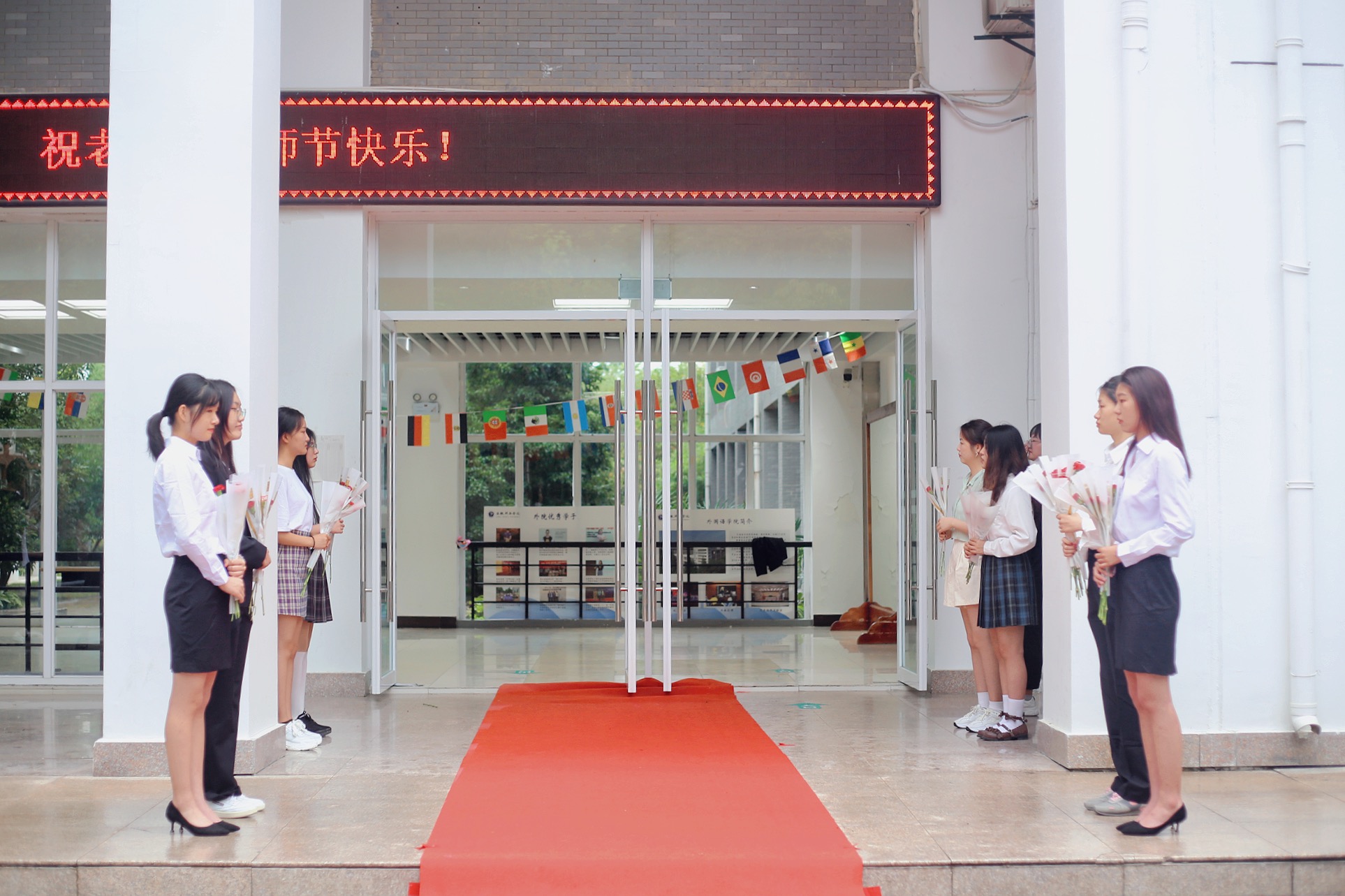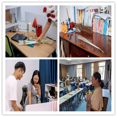 9月10日上午,外国语学院全体领导班子,为每位进入教学楼的教师献花,表达节日祝福。学生社团组织各班级,在上课前10分钟,为第一节课授课的教师悄悄地准备了惊喜,教师们纷纷表示感动。当日上午的第一课中,伟德国际1949始于英国校长石秀和代表学校进行教学检查,石校长走进教室向一线教师表达节日祝福,并与课堂学生亲切交谈,教师和学生们都表示很感动。