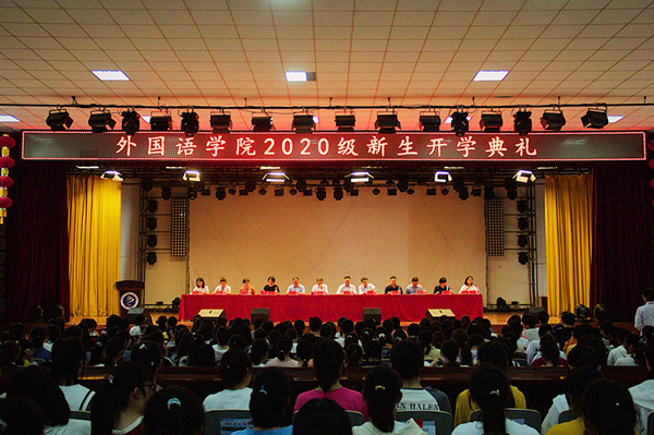 本网讯(通讯员:杨静)时值金秋、秋风飒爽,在这个美丽而富有收获的季节,外国语学院于9月29日举行2020级新生开学典礼。外国语学院院长张杰,副院长杨光、周平、王志宏、院长助理陈丽,各系部主任、全体辅导员老师以及部分教师代表和2020级全体新生参会。本次大会由陈丽主持、17级英语专业学生白云担任英文翻译。