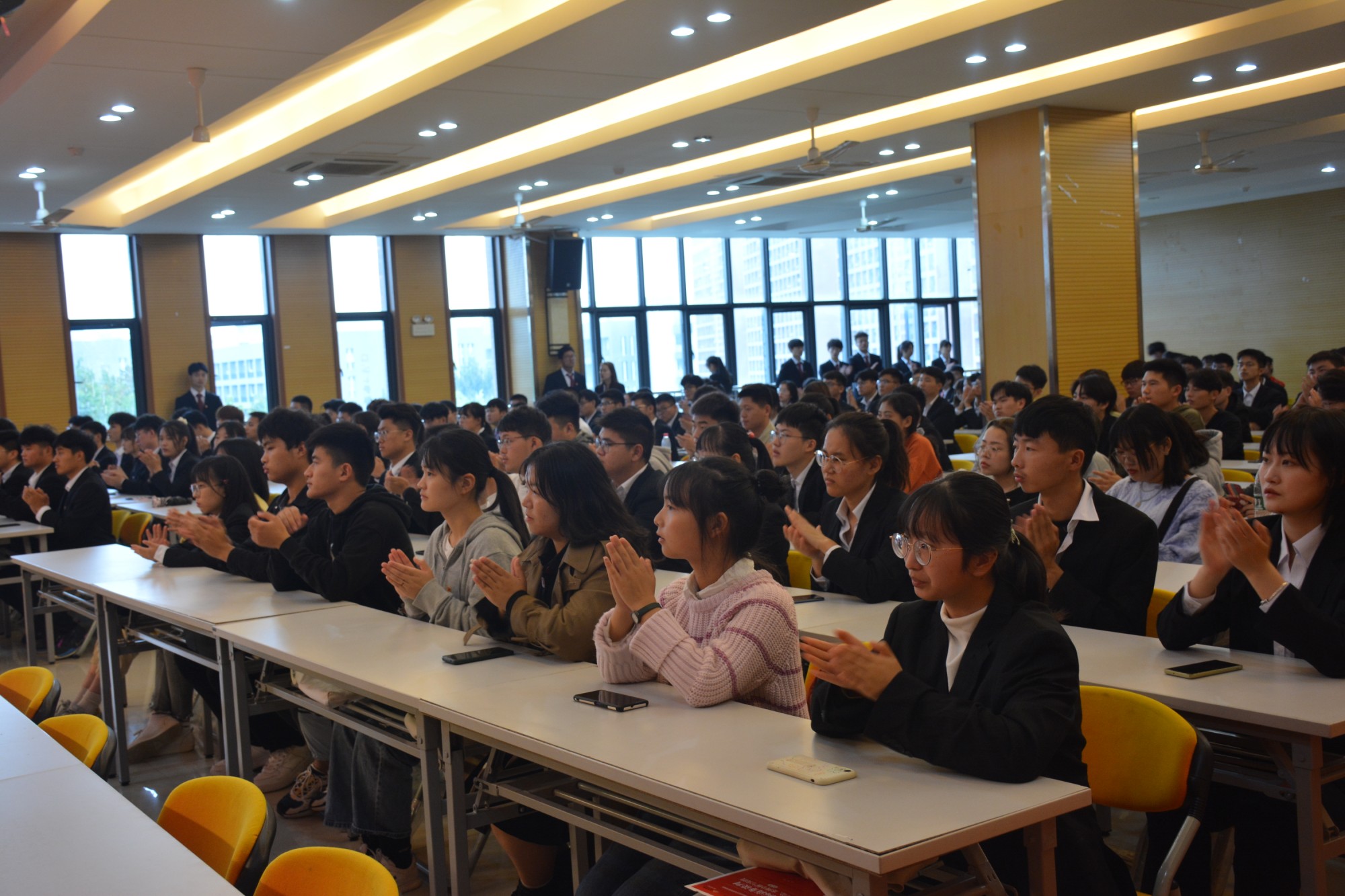 大会在庄严的团歌中拉开序幕。首先,王丹立与魏居娴宣读第十五届先进个人和优秀学生骨干的名单,并由周刘湘与彭智为其颁发荣誉证书,为新一届的团总支成员树立了典型,树立了榜样。随后,第十五届团总支学生副书记陈润洲做工作汇报,汇报了上一届工作中取得的成绩,总结了存在的不足,同时对新一届团总支充满希望。接着,魏高莉宣读新一届团总支学生骨干名单,并由俞士毛为学生骨干颁发聘书,合影留念。接着,第十六届团总支学生副书记吴佩玉对新学年的工作做出了工作规划,她表示将会沿袭上届团总支的优良传统,并在此基础上进行突破和创新,展望未来,迎接挑战,不忘初心,砥砺前行。国旗护卫队四名擎旗手手擎团旗,与新老两届团总支副书记进行了旗帜交接,团总支全体成员进行宣誓仪式,象征着责任与使命的传承。